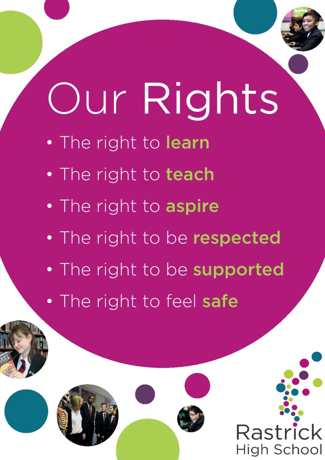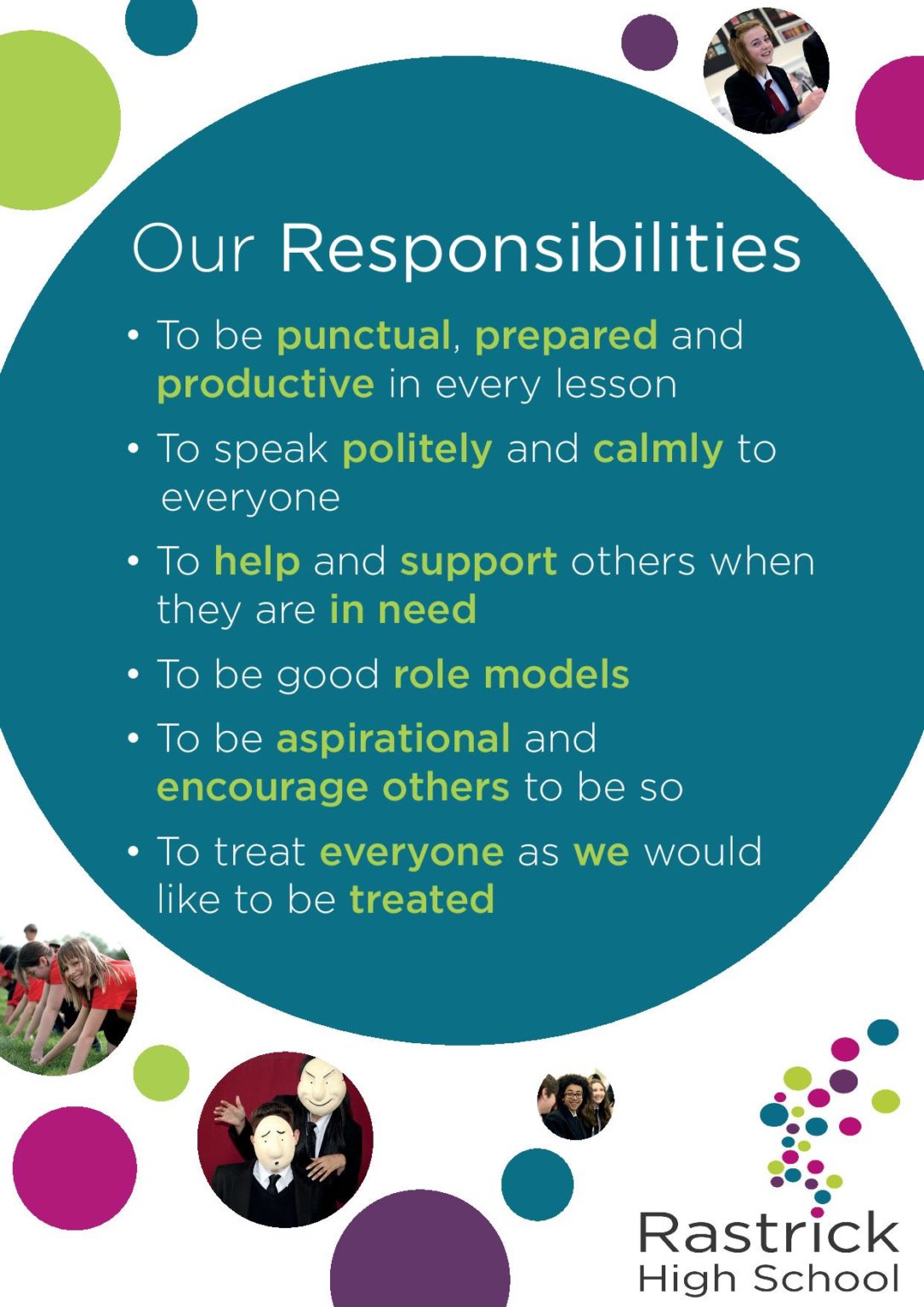 The understanding of these values and expectations within our school community has been the basis of a whole school consultation on the Climate for Learning, the outcome of which is the introduction of the schools ‘Rights & Responsibilities’ charter. The charter clearly defines the ‘Rights’ of all persons at Rastrick and in addition the ‘Responsibilities’ we have as members of the Rastrick community in upholding these ‘Rights’.